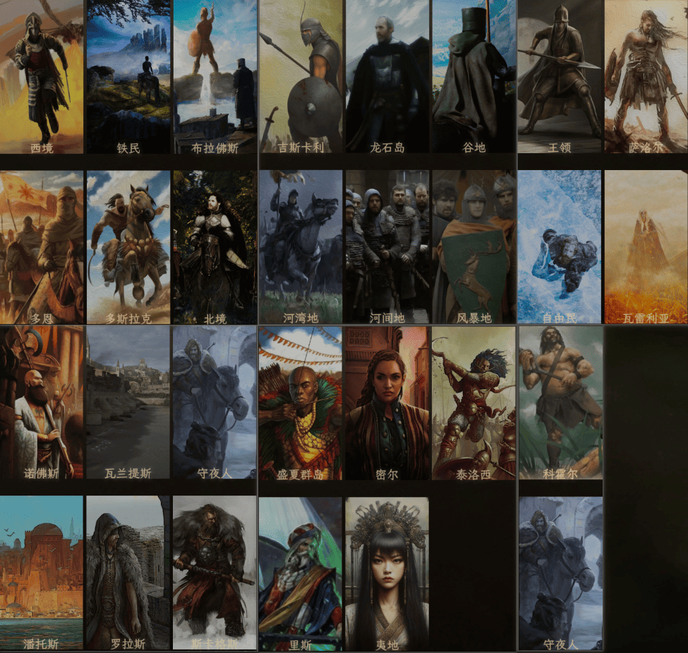 初始界面的文化选择将会决定玩家的出生地和所属文化,《权游国度》在新版本中共计为我们提供了30种可以选择的文化,其中不乏我们熟知的西境、北境、风暴地、王领。